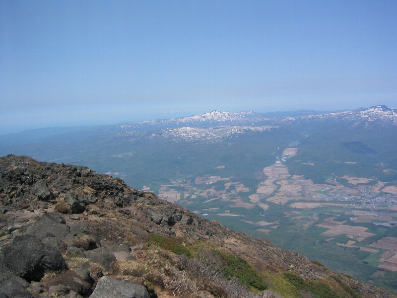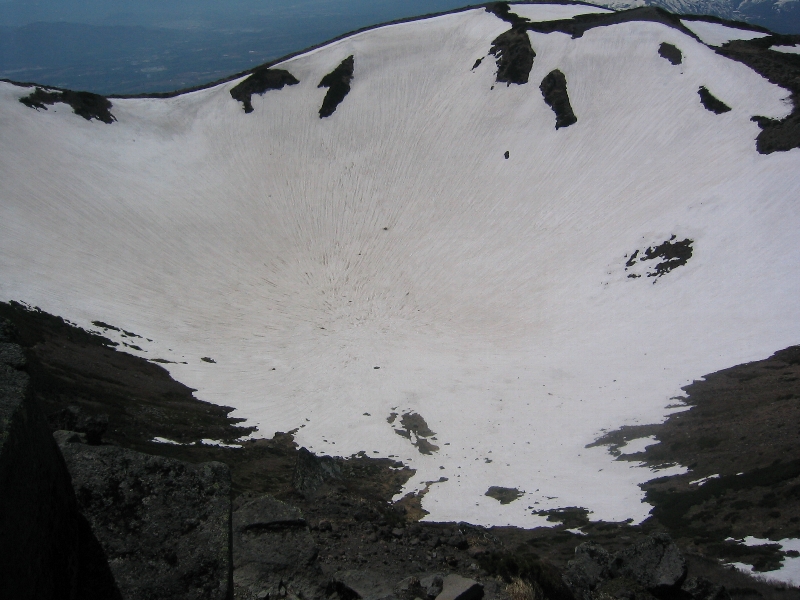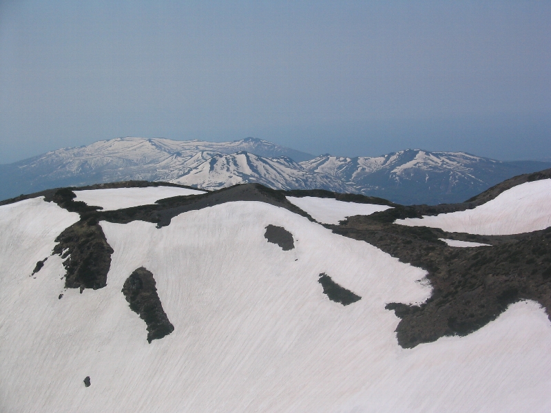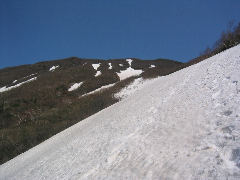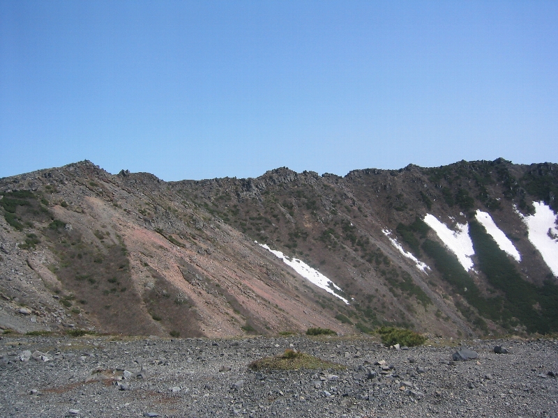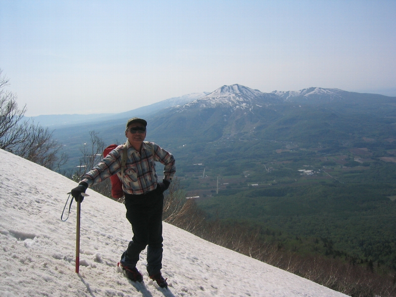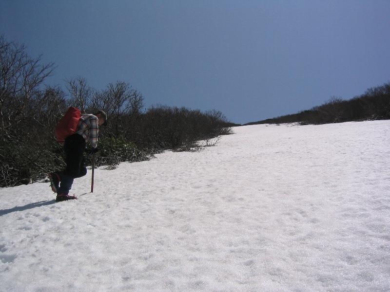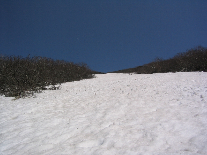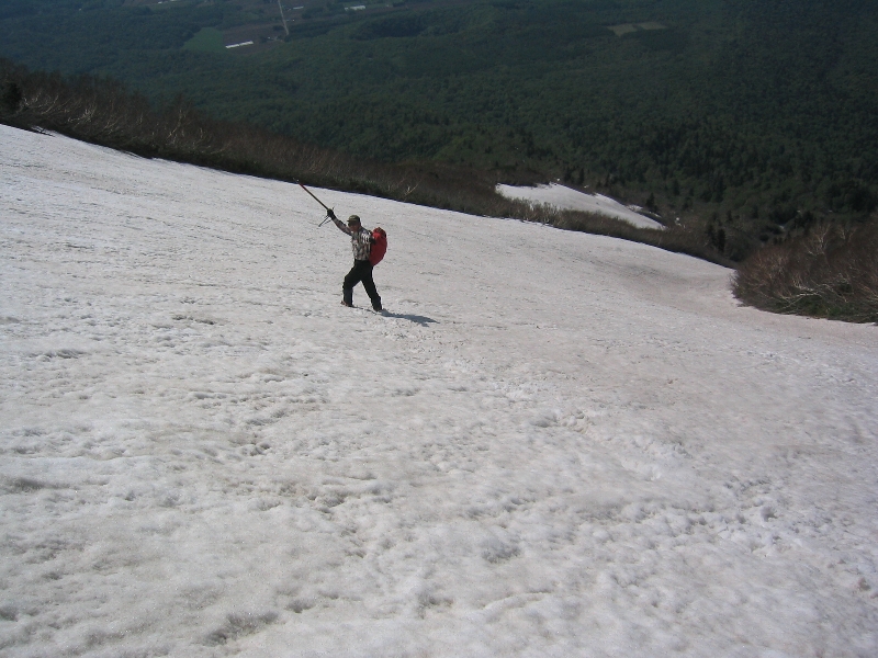 | 2006.06.03/晴 今年は5月遅くまで、札幌近郊の山から残雪をまとった白い羊蹄山が見えた。二週間前に漁岳から羊蹄 を眺め、一緒に登った西山さんと雪のあるうちに羊蹄山に行こうという話になり、この日の山行となった。 早朝、札幌から車をとばし倶知安町比羅夫に向かう。途中、京極町から眺望する羊蹄山は、円錐形の 美しい姿に、沢筋はびっしりと雪渓で埋まっており、一際輝いて見える。 快晴の中、比羅夫登山口を7:45に出発。我々以外に先行者なし。しばらくは、樹林帯の静かな登山道 を行く。四合目を過ぎ、標高1,100mあたりで、登山道が雪に隠れ、いよいよヒラフ沢の雪渓に取り付く。 雪渓の上部は細くなって二ヶ所ほど切れ目があるのを見通せたが、多分九合目までは何とかなるだろう と見当をつける。 かなりの急斜面、滑落が怖い。ジグを切りながらグングン高度を稼いでいく。標高差およそ700mはある 大雪渓の直登だ。下を振り返ると足がすくむほどの高度感。やはり雪渓は九合目、避難小屋 との分岐まで 続いていた。ここからは夏道の登山道を辿り、13:10勇躍ピークに立つ。 360度の大展望に感動。しばし山座同定。眼下に父釜の大クレーター。その釜越しにはアンヌプリなどの ニセコ連山、遠く積丹や無意根山など札幌の山並み、手前に尻別山、洞爺湖の向こうに遙か駒ヶ岳も 望まれる。大満足。 (コースタイム) 登山口 1:45 四合目上 2:30 九合目 1:10 羊蹄山頂上 2:28 登山口 ![]() ![]() ![]() ![]() ![]() ![]() トップページ HOMEに戻る |