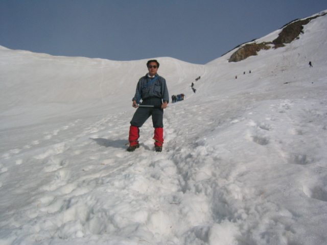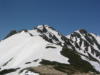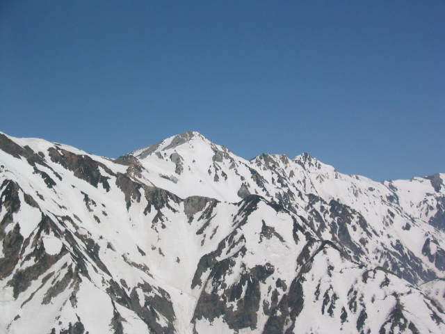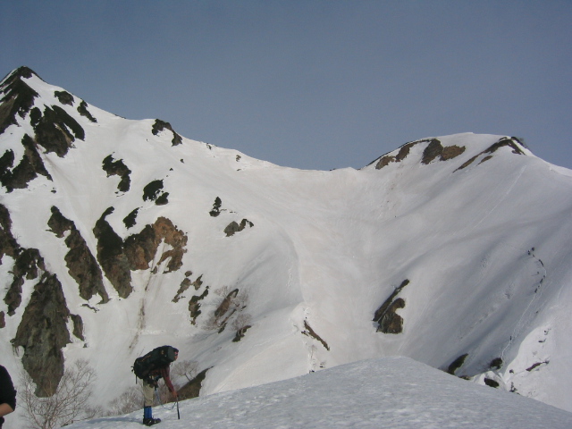 唐松山荘で昼飯を食って、五竜に向けて出発する。稜線の雪は吹き飛ばされてほとんどない。途中の岩場をやり