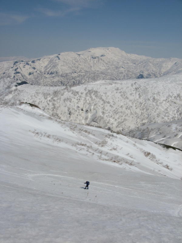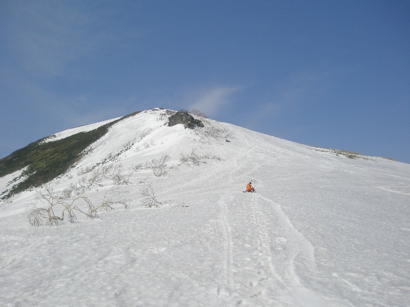 | 09.04.29/快晴 昨年10月以来の暫らくぶりの山行。絶好の春山日和。 幌の林道は雪解けが進み、標高260m地点まで車で入ることができた。駐車帯は車で一杯だ。 ここからスキー、大阪山を巻くように林道に沿って行く。体が重い。3時間15分で浜益御殿。 目指す雄冬山が手に取るように望まれる。 御殿からコルに一気に下る。帰りの登り返しが辛そうだ。しばらく平坦なコルを行く。 雄冬山の直下の壁は急斜面。右手の斜面ををジグを切りながら我慢の登り。 御殿から1時間43分。登頂。 大パノラマに感動。暑寒別岳、群別岳と奥徳富岳、浜益岳、浜益御殿。まるで白い屏風のようだ。 帰路は、雄冬山の大斜面をスキー滑降。御殿からも樹間を長い滑降。久しぶりに雪山を満喫。 ![]() ![]() YouTubeで動画をご覧ください。 (コースタイム) 幌林道登山口 3:15 浜益御殿 1:43 雄冬山 1:43(途中昼食) 御殿 0:55 登山口 |