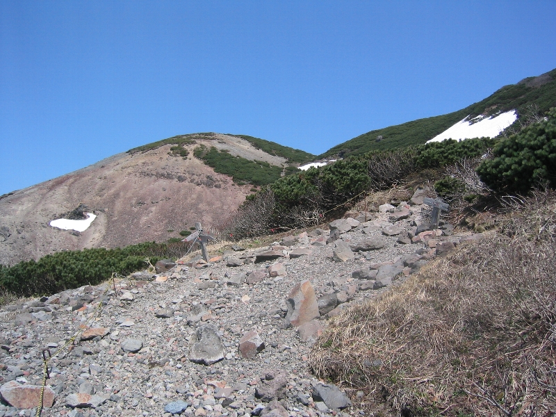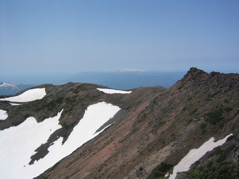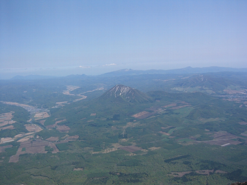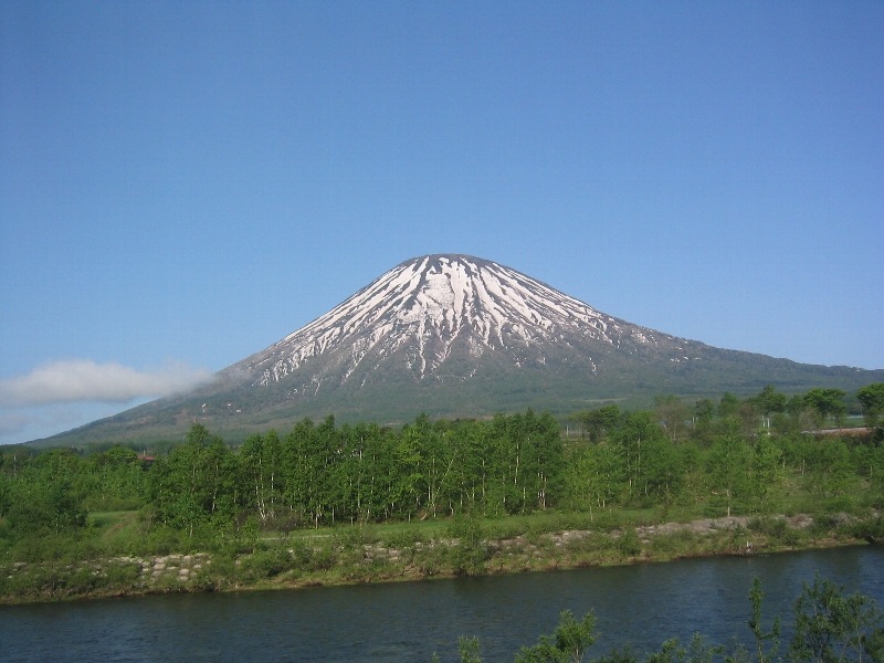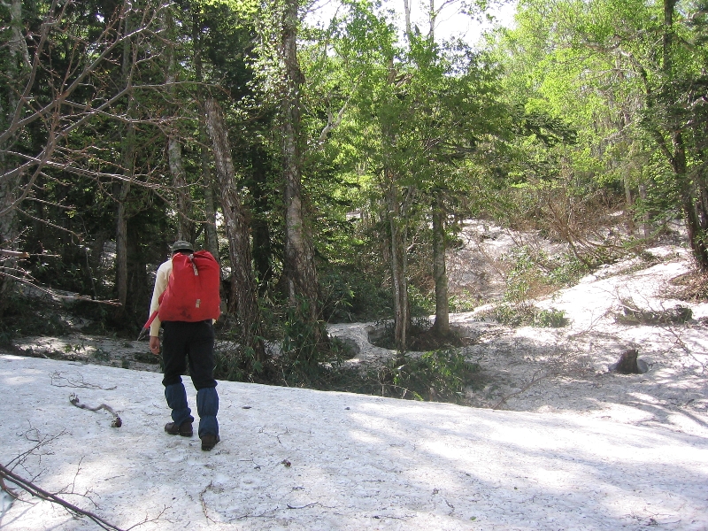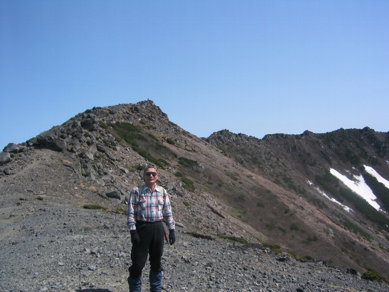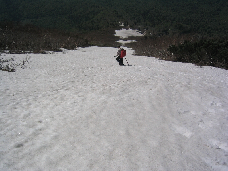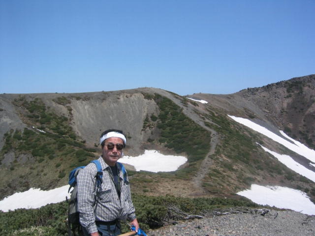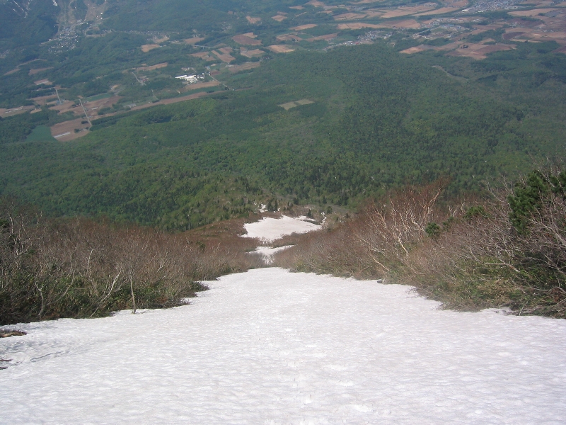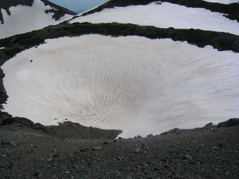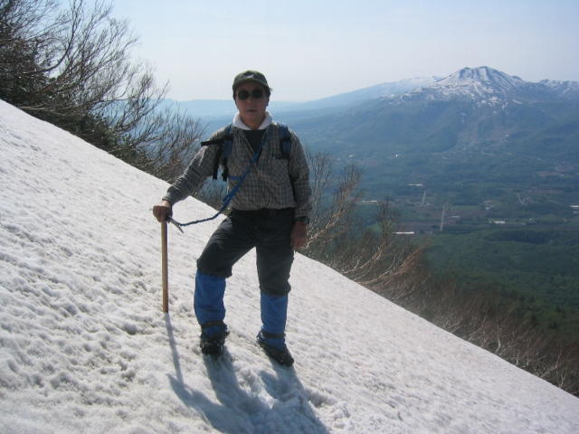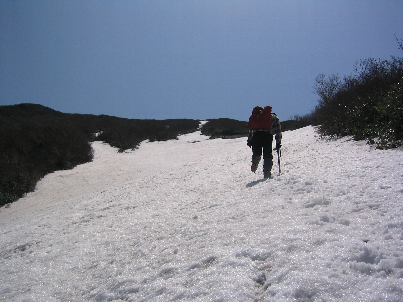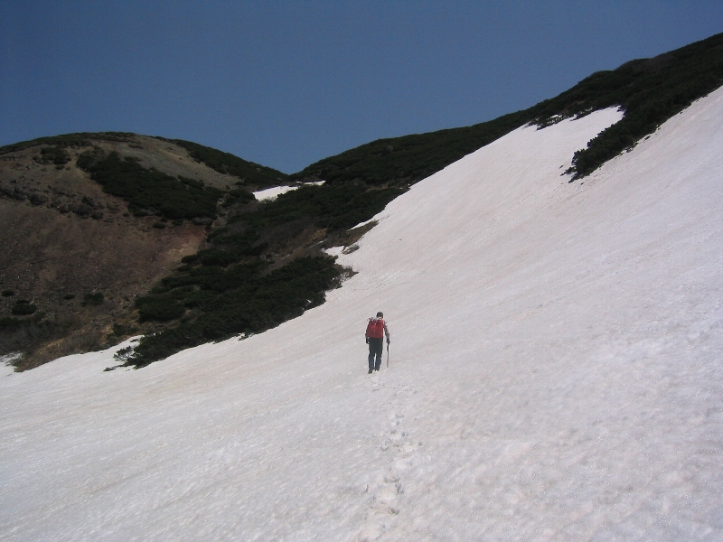 | 2006.06.03/晴 今年は5月遅くまで、札幌近郊の山から残雪をまとった白い羊蹄山が見えた。二週間前に漁岳から羊蹄 を眺め、一緒に登った西山さんと雪のあるうちに羊蹄山に行こうという話になり、この日の山行となった。 早朝、札幌から車をとばし倶知安町比羅夫に向かう。途中、京極町から眺望する羊蹄山は、円錐形の 美しい姿に、沢筋はびっしりと雪渓で埋まっており、一際輝いて見える。 快晴の中、比羅夫登山口を7:45に出発。我々以外に先行者なし。しばらくは、樹林帯の静かな登山道 を行く。四合目を過ぎ、標高1,100mあたりで、登山道が雪に隠れ、いよいよヒラフ沢の雪渓に取り付く。 雪渓の上部は細くなって二ヶ所ほど切れ目があるのを見通せたが、多分九合目までは何とかなるだろう と見当をつける。 かなりの急斜面、滑落が怖い。ジグを切りながらグングン高度を稼いでいく。標高差およそ700mはある 大雪渓の直登だ。下を振り返ると足がすくむほどの高度感。やはり雪渓は九合目、避難小屋 との分岐まで 続いていた。ここからは夏道の登山道を辿り、13:10勇躍ピークに立つ。 360度の大展望に感動。しばし山座同定。眼下に父釜の大クレーター。その釜越しにはアンヌプリなどの ニセコ連山、遠く積丹や無意根山など札幌の山並み、手前に尻別山、洞爺湖の向こうに遙か駒ヶ岳も 望まれる。大満足。 (コースタイム) 登山口 1:45 四合目上 2:30 九合目 1:10 羊蹄山頂上 2:28 登山口 ![]() ![]() ![]() ![]() ![]() ![]() トップページ HOMEに戻る |