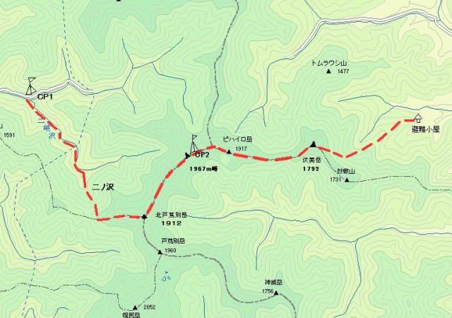 コース/ 千呂露川二岐沢出合 ― 北戸蔦別岳 ― 1,967峰 ― ピパイロ岳 ― 伏美岳