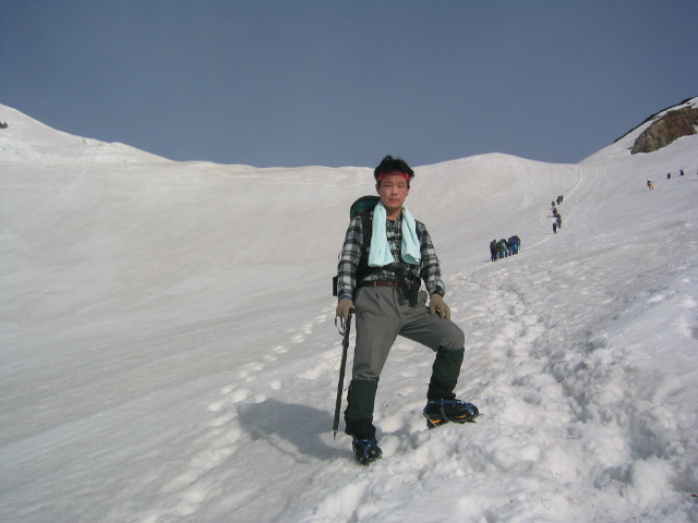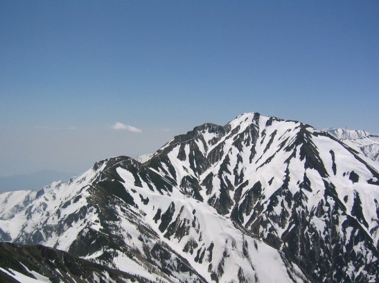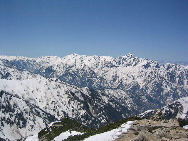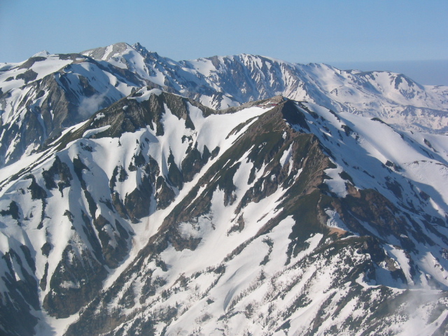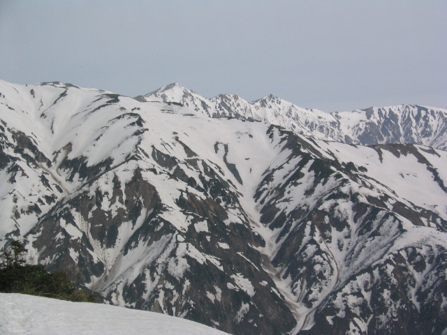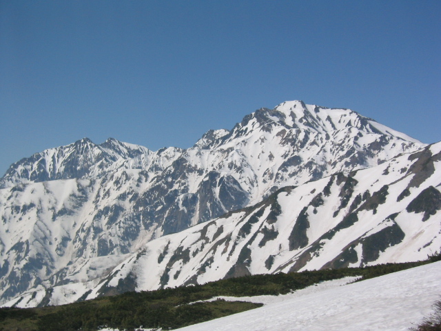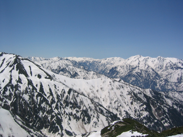 現れて雪山らしくなった。前方に唐松岳、左右に雄大な白馬三山、五竜、鹿島槍の山並みを見ながら高度を上げて