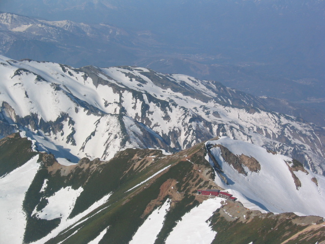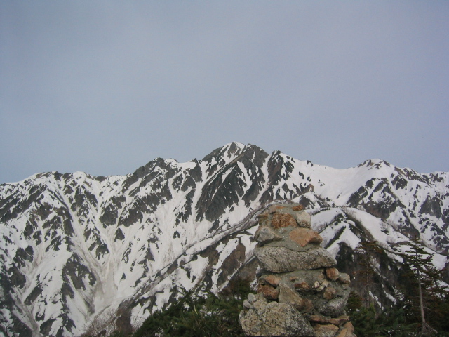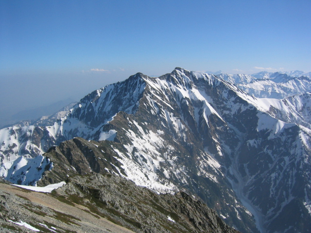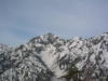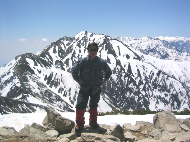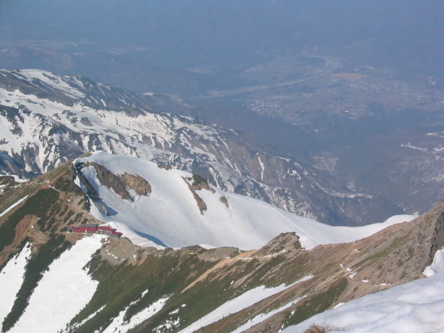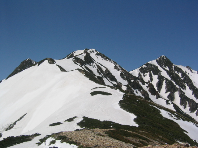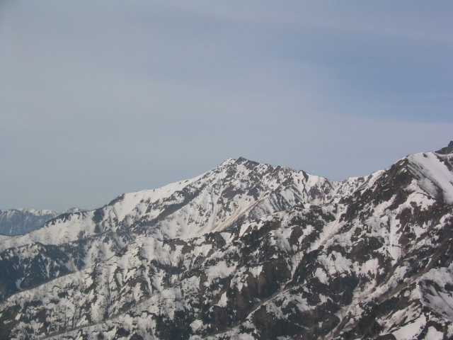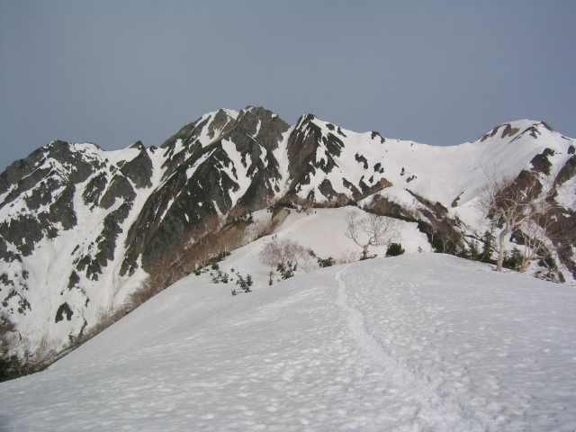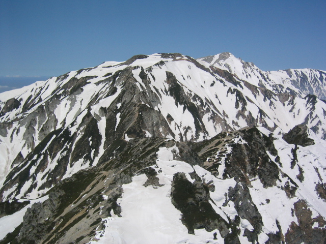 唐松山荘で昼飯を食って、五竜に向けて出発する。稜線の雪は吹き飛ばされてほとんどない。途中の岩場をやり
